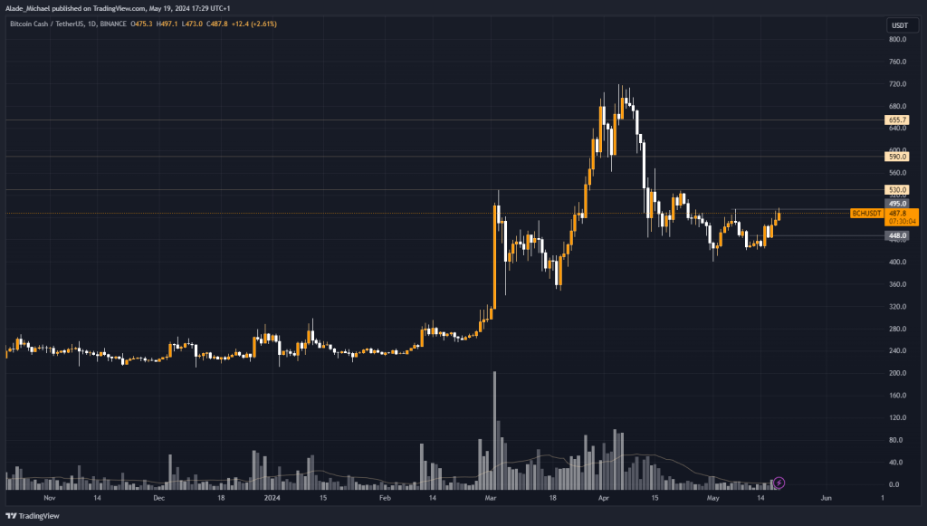 Ending a three-week correction at precisely $400, which is now serving as a key support level, BCH increased for a week to retest $495 and lost steam due to a rejection. That led to a drop and the price rolled back.
