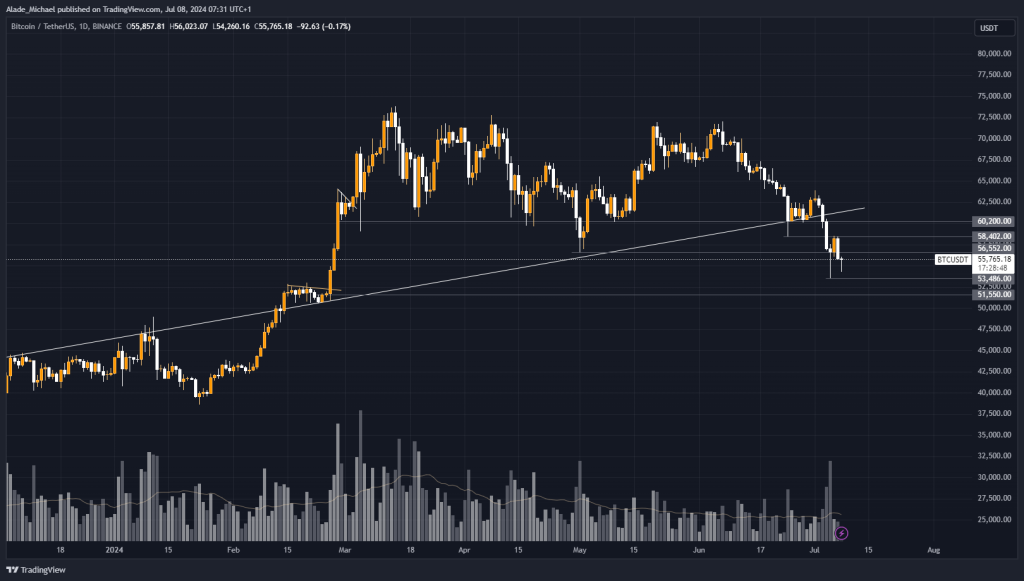 Following a small recovery to the $53,800 area on the first day of this month, Bitcoin initiated a drop and extended bearishness below a long-rising trendline that served as diagonal support since March. It is now acting as resistance on the daily timeframe.
