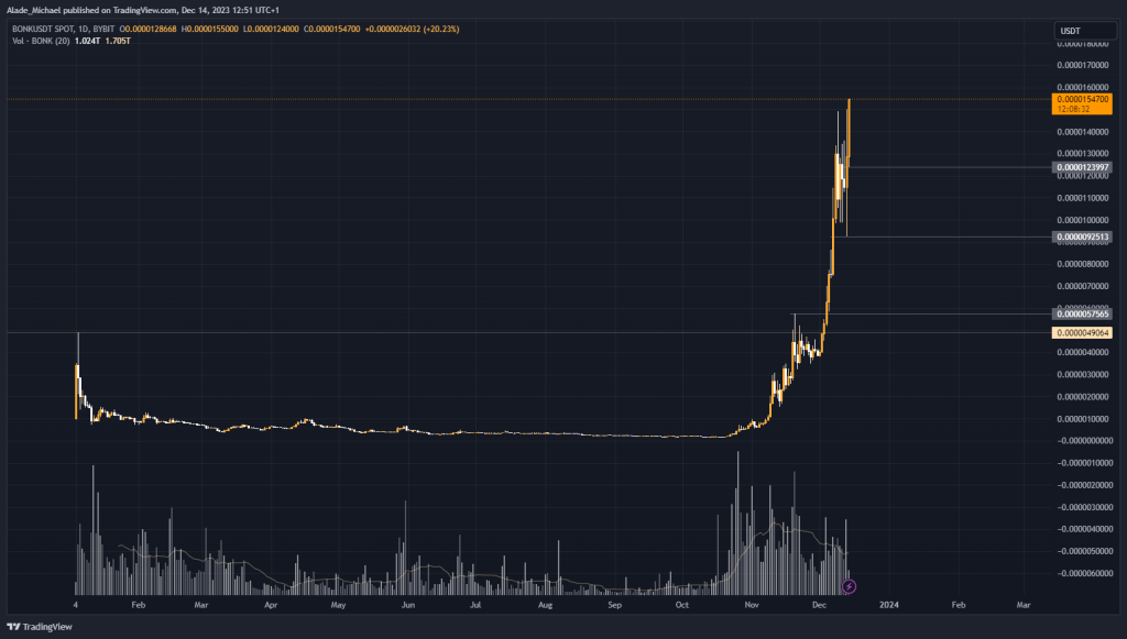 In mid-October, Bonk bottomed at $0.0000001 and began to show signs of strength. It closed bullish that month and crossed into November with a slight pullback. It bounced back and surged through January high to tap $0.00000576.