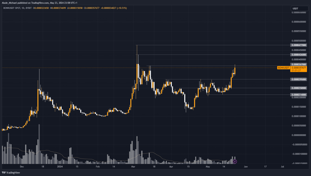 Looking back to where the price started to pick up in mid-April, Bonk has seen a lot of recovery and has continued to show signs of strength daily. It has seen a slight rejection due to a recent drop in the market.