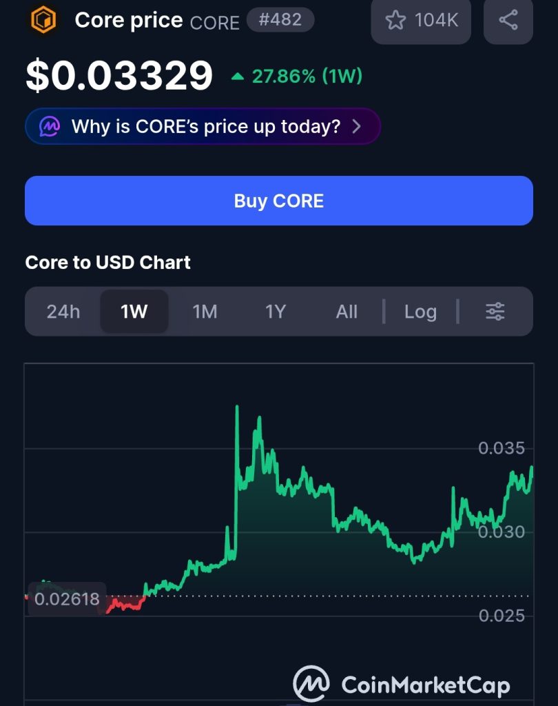 Note that $CORE has had a reasonable short term rally. The price is currently at around $0.03269 (+10.96%) over 24 hours, with an intraday high of $0.03432 and a low of $0.02943 so far today The perpetual contract price tracks this relatively exactly, sitting at nearly $0.03256, +11.01%.