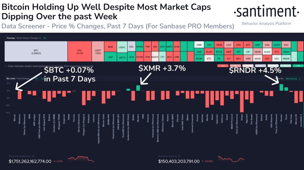 Bitcoin, the digital gold standard, has shown remarkable resilience, maintaining a steady price level at around $27,400. While the broader crypto space exhibited some volatility, a couple of altcoins have stood out during this period, notably Monero (XMR) and Render Token (RNDR), both showing positive gains.