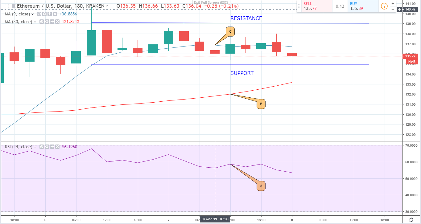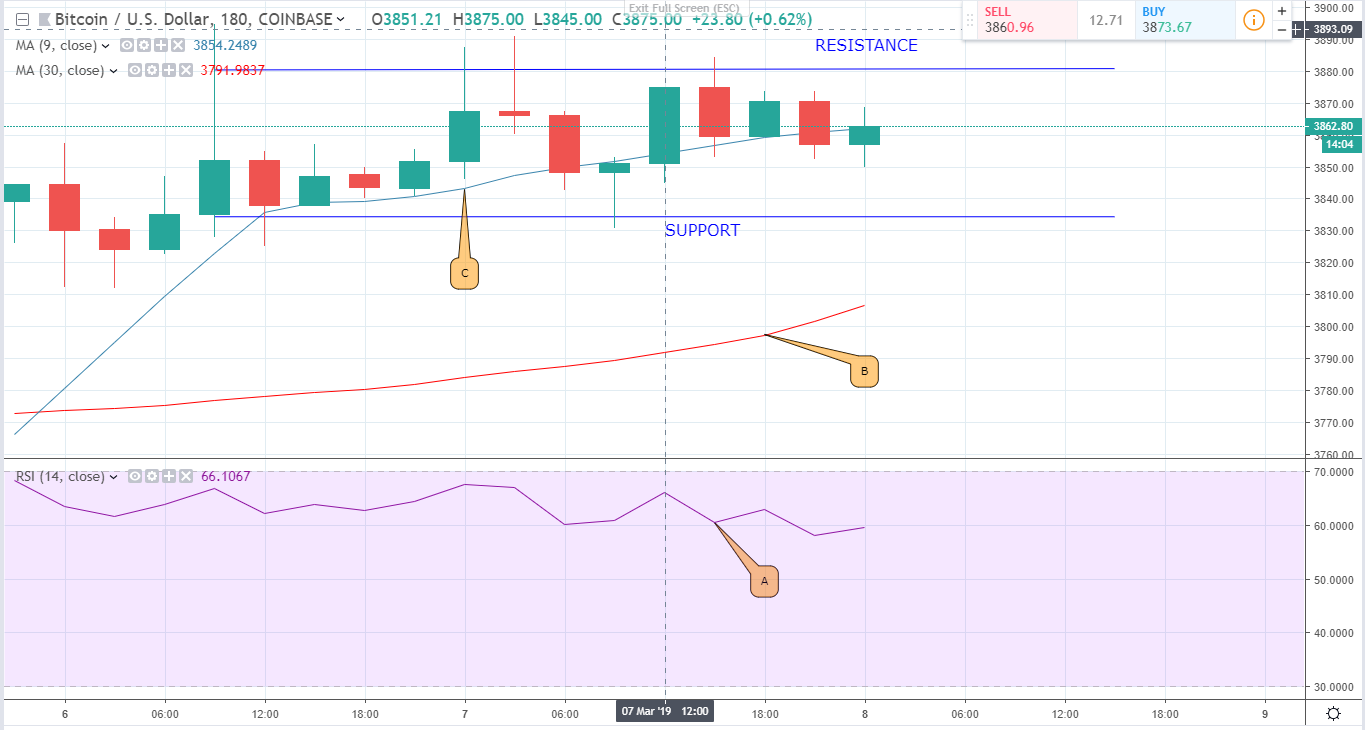 The BTC/USD pair is now up by 2% over the last 24 hours. It was selling at $3851 as of March 7 and is now trading at $3860. The uptrend is supported by both moving averages which are upward-facing. At the moment, the 9 day EMA (C) is acting as the price support at $3860 which shows a strong upward rally.