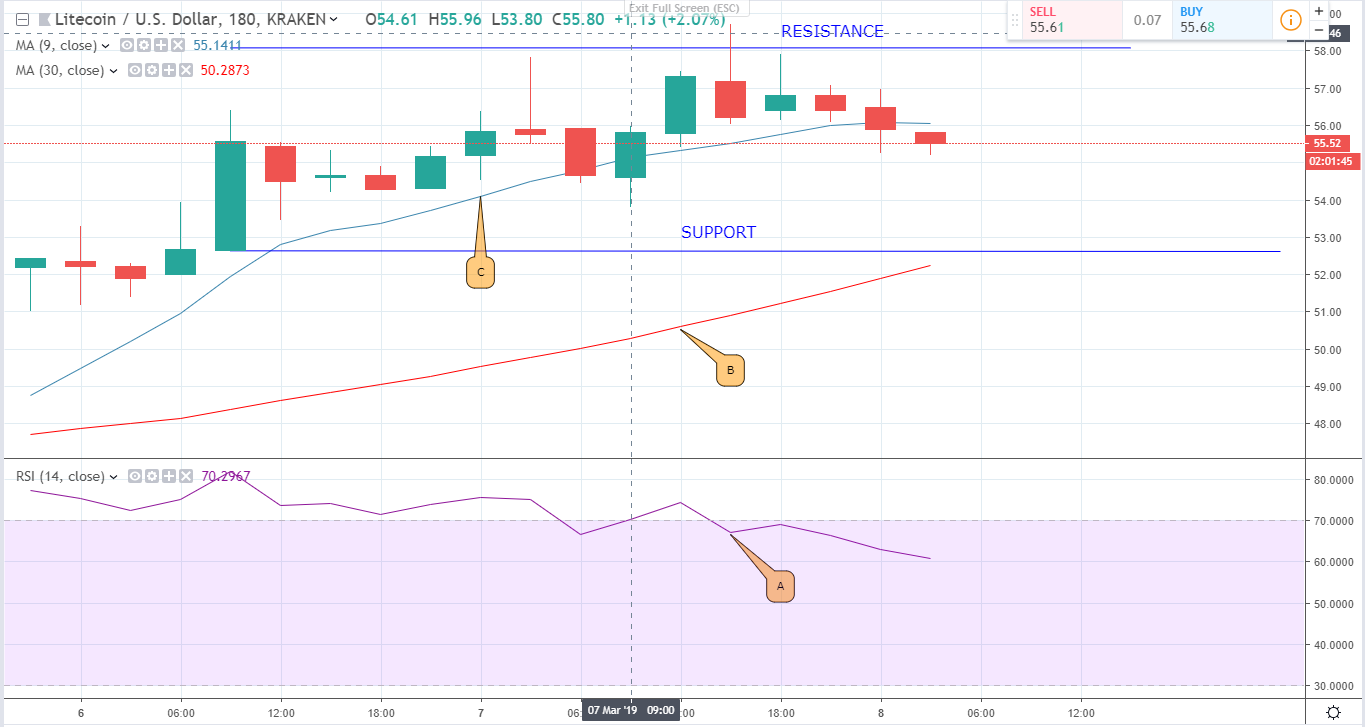This Bullish outlook has pushed Litecoin’s market sentiments into the undersold area as investors are upbeat of better prices. This is as shown in the RSI (A).