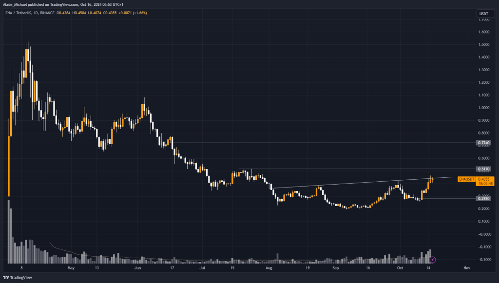 Looking at the daily chart, ENA has retraced slightly to where it now trades at $0.43. While the key $0.4 level serves as a support for the market, losing it may bring a little drawdown before picking up again.
