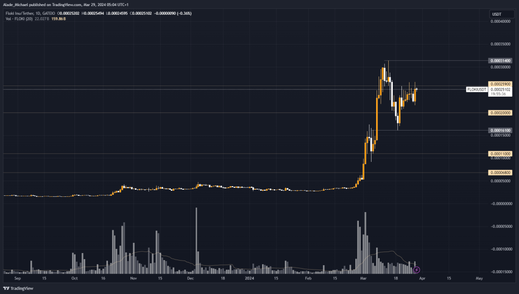 But if Floki’s bulls mount pressure at this resistance, we may see a big break-up. Right now, the daily volume indicator is down, suggesting capital outflow at the press time. Still, the bulls are in control.