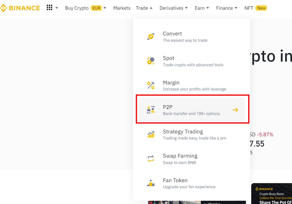 1. Go to the main Binance page and log in. Then in the top menu go to the “Trade” tab and click “P2P”. Alternatively, you can just click directly on this link.