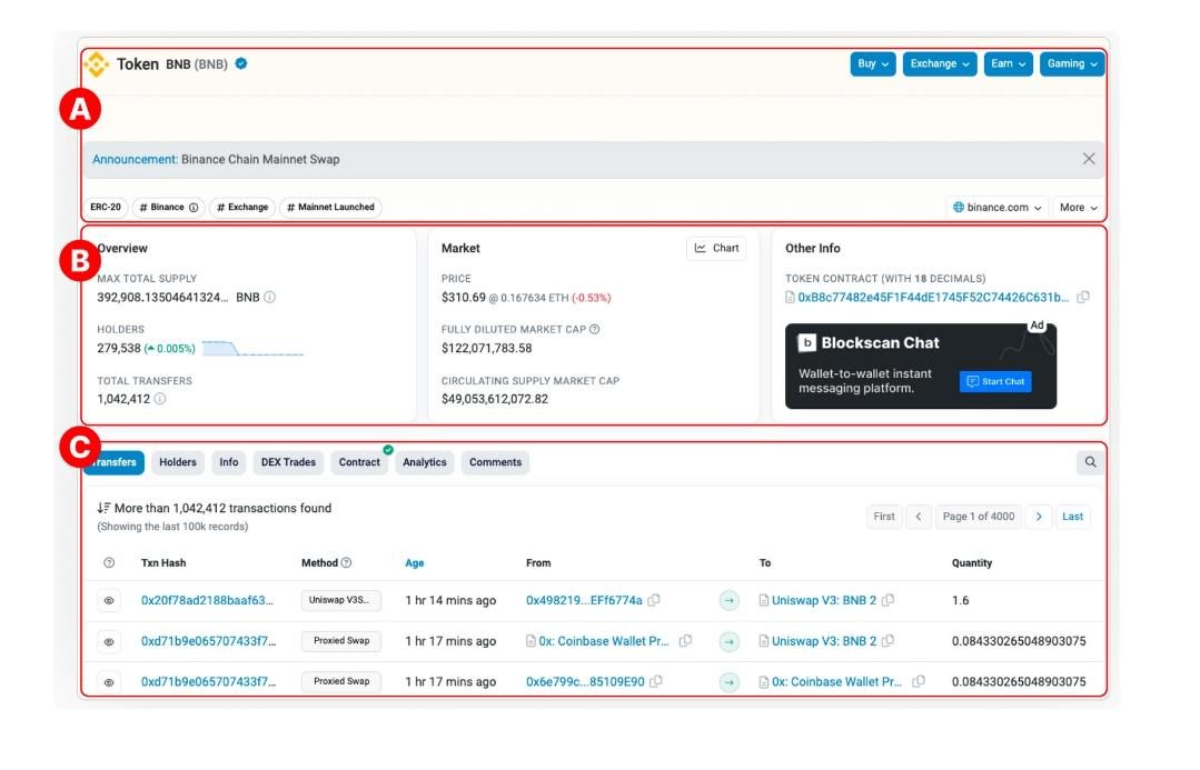 If you want to research a token (rather than a wallet), search by its contract or mint address. On SolScan you can search the SPL token address or even its ticker, but the safest way is by the token’s address. You’ll then see a token page with data like total supply, holders, transfers, price charts, etc. (see image below). On Etherscan/BaseScan, searching an ERC-20 contract brings up a token info page with Holders and Transfers tabs. The Holders tab lists all addresses holding the token and their percentage of the supply. Large holders there could be team wallets. The Transfers tab shows the chronological token transfer history. These token pages help you spot if a few wallets control most of a token, or how active it is on exchanges.