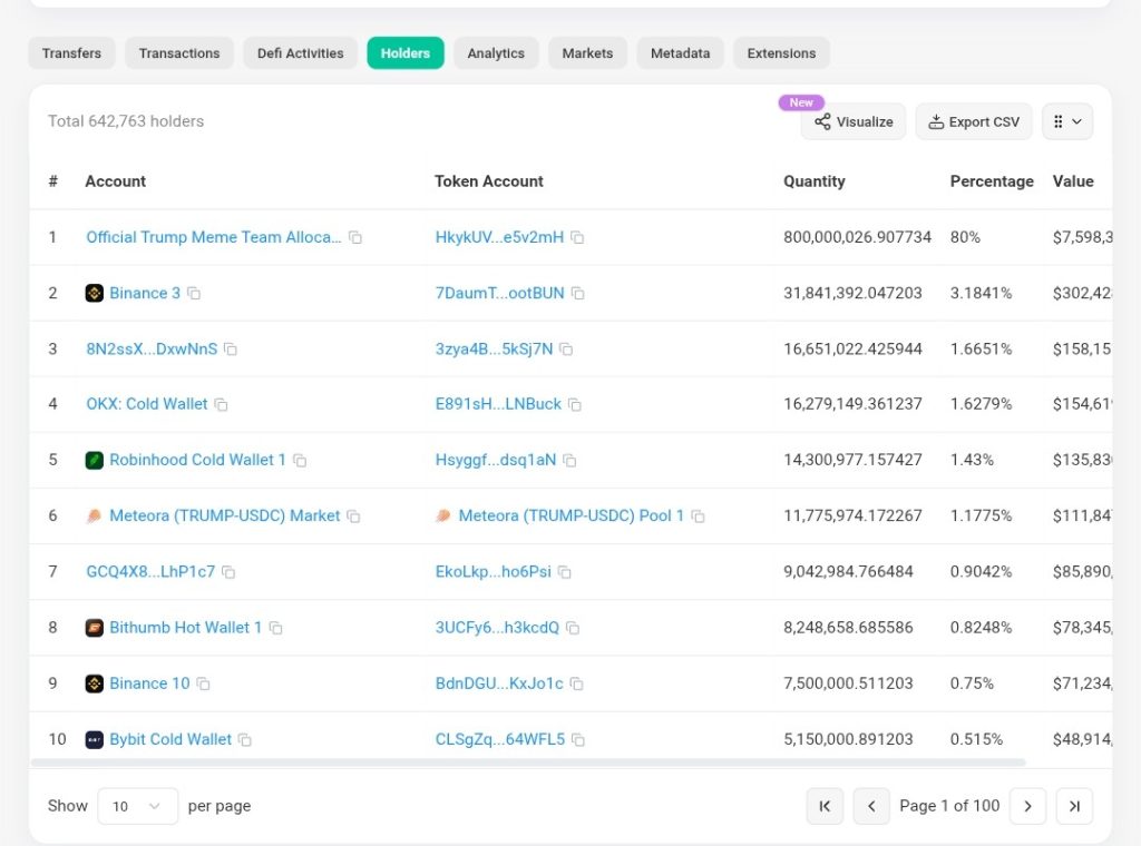 To analyze a Solana-based token, open SolScan and paste the token’s symbol or mint address into the search bar. On the token’s info page you’ll see core metrics (price, total and circulating supply, etc.) and tabs like Holders, Transfers, Metadata, etc. Clicking Holders brings up a list of the largest addresses and the percentage of supply each holds. This reveals any big whales at a glance. For example, below is a SolScan “Holders” view (USDC on Solana): it shows each top wallet’s share of the supply. Such charts make it easy to spot when a few addresses (often exchanges or team wallets) dominate. If a few wallets hold tens of percent of the supply, that’s a warning sign.
