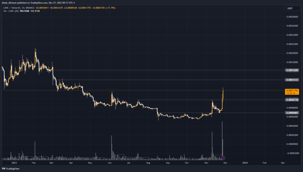 Lunc started to show signs of strength after establishing support at $0.000055 in October.