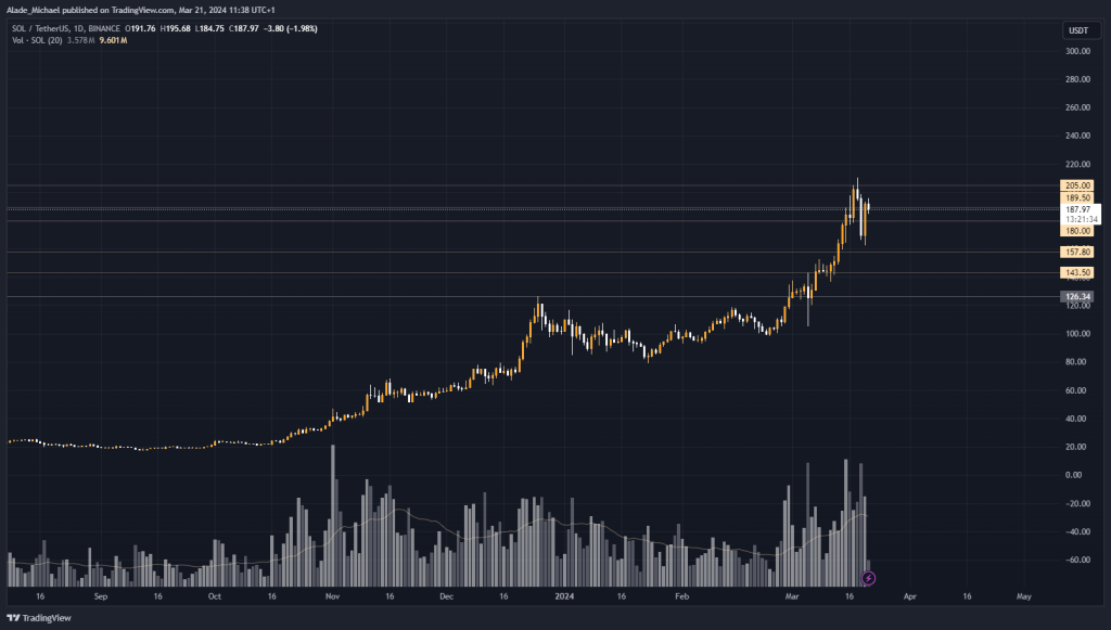 Sol’s holding resistance right now lies at $205 and the crucial $210 level. Surpassing these resistance levels could facilitate bigger moves to $220 and potentially $230 in the near term.