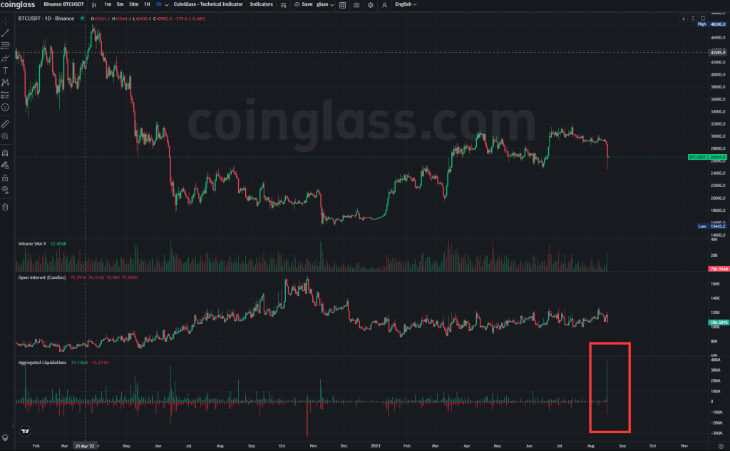 The recent sharp decline in Bitcoin’s price from $29k to $25k within 24 hours has sent shockwaves through the cryptocurrency market. This significant drop has resulted in the liquidation of 174,892 traders, amounting to a staggering $1.04 billion in total liquidations.