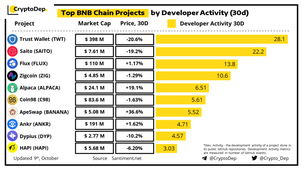 Leading the pack is TrustWallet, with a remarkable developer activity score of 28.1. TrustWallet, a popular cryptocurrency wallet, continues to evolve as a user-friendly and secure option for managing digital assets on the BNBChain.